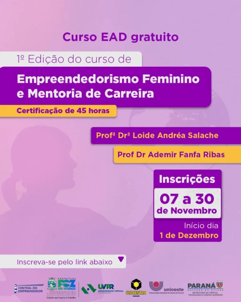 Está aberta a 1ª edição do curso EAD gratuito de Empreendedorismo Feminino e Mentoria de Carreira! Está curso está sendo realizado pela UNICENTRO em parceria com a SMDE- Secretaria de Desenvolvimento Econômico, Trabalho e Agricultura, em conjunto com a Central do Empreendedor. e demais pareceiros! São 45 horas de certificação com professores renomados e conteúdos […]